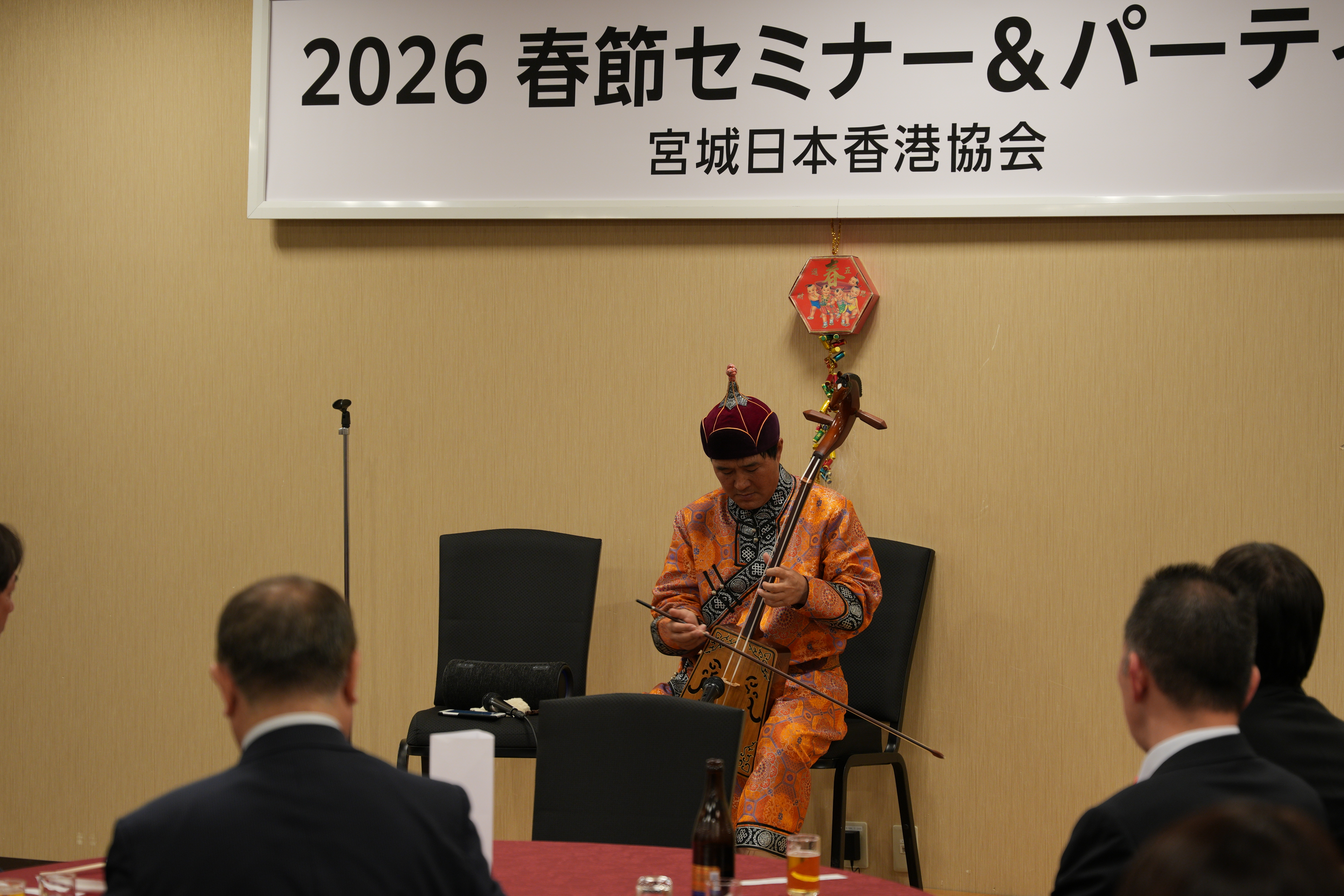 会場には香港をイメージした装飾が施され、参加者の皆様には料理とともに香港の雰囲気をお楽しみいただきました。また、バヤラト氏による馬頭琴の演奏が披露され、伝統的で力強い音色に大きな拍手が送られました。
