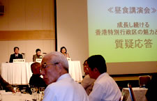 Ny-lon-kong として、今や世界の経済はニューヨーク、ロンドンそして香港が牽引していること、香港にとって日本が第2位の輸入国であり第3位の輸出国となるほど緊密な貿易相手国であること、そして香港が13億人を抱える中国市場の玄関口として重要な拠点であり、香港と中国はCEPAと称して関税がかからない協定を結んでいることなど、香港がビジネスチャンスにおいて最も優れていることなどについて講演されました。